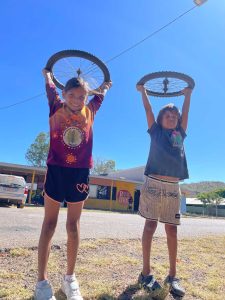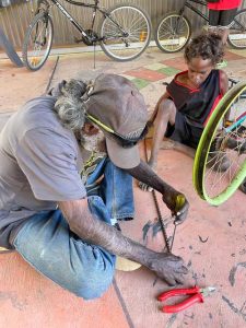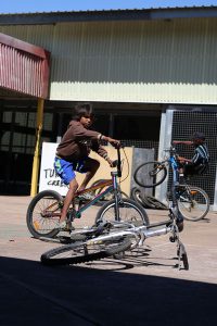 The next day another 25+ kids turned up. They collected the bikes and got to work. This time even more willing helpers turned up. Later that day Chris was asked to join in a men’s group meeting. One of the fathers was brimming with happiness as he explained how his daughter came home with a bike and excitedly explained that yes it was really hers, she even put the pedals and wheels on. Another man said how happy he was to see happy kids cycling everywhere. Morning workshops continued and the feedback was delightful. When parents and carers said “the adults are happier because the kids are happier”, and “kids are going to bed earlier because they’re tired and they want to get up early and ride their bikes”, and “adults aren’t shouting at the kids” – wow! NAIDOC day came and Chris and Gabz joined in the celebrations at the basketball courts.